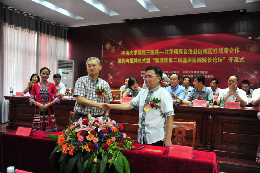 2013年6月19日,中南大學湘雅三醫院為江華縣人民醫院授牌“中南大學湘雅三醫院技術指導醫院”,與江華縣人民政府簽署醫療幫扶戰略協議,與江華縣人民醫院簽署醫療幫扶合作協議,拉開健康扶貧的序幕。