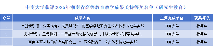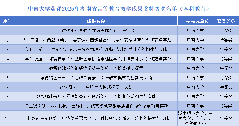 本網(wǎng)訊 日前,湖南省教育廳公布了2025年高等教育教學(xué)成果獎獲獎成果名單。中南大學(xué)共獲得教學(xué)成果獎成果57項,其中作為牽頭單位獲特等獎12項、一等獎23項、二等獎20項;以參與單位獲特等獎1項、二等獎1項。